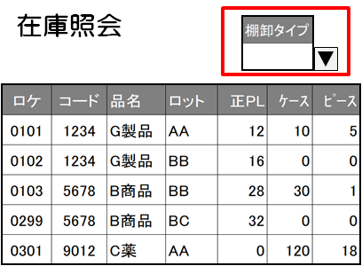 在庫照会メニューにて日付を指定して在庫データを表示したのち、棚卸リストを発行できます。棚卸の種類は2種類あり、ドロップダウンリストより選択できます。